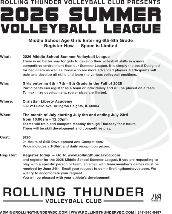 Open to 6th-8th grade Girls. There is no better way for girls to develop their Volleyball skills in a more competitive environment than the Summer League. The program is designed for beginners as well as those that are more advanced players. Participants will train and develop all skills and learn the various Volleyball positions. Participants can register as a team or individually and will be placed on a team.